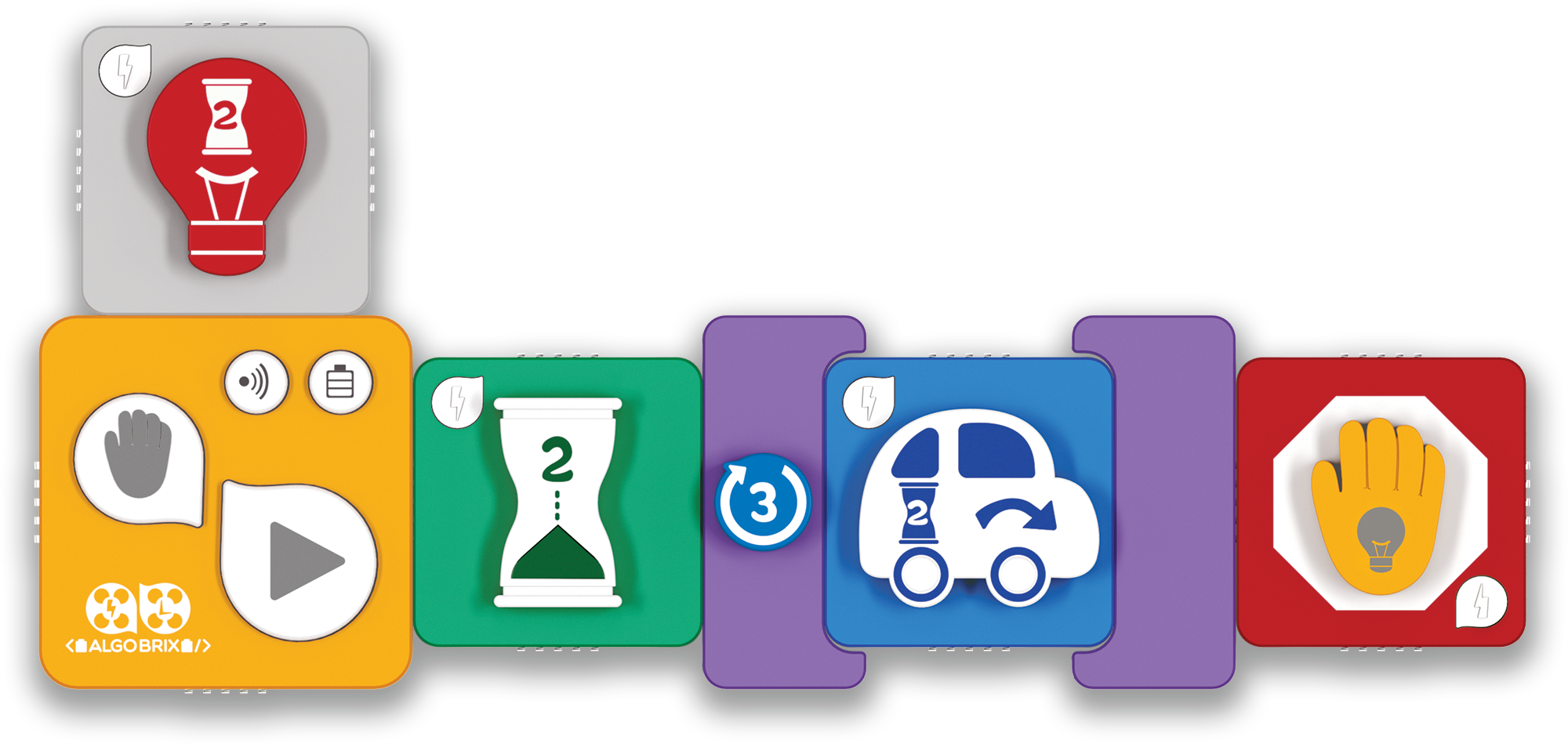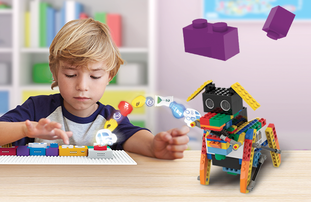 Con el lenguaje de programación interactivo de Algobrix®, los estudiantes comienzan construyendo un modelo en bloques de construcción, y luego crean varias secuencias de programación utilizando bloques de Función y Parámetro. Finalmente, al pulsar el bloque Play, el robot realizará la secuencia de programación creada.